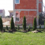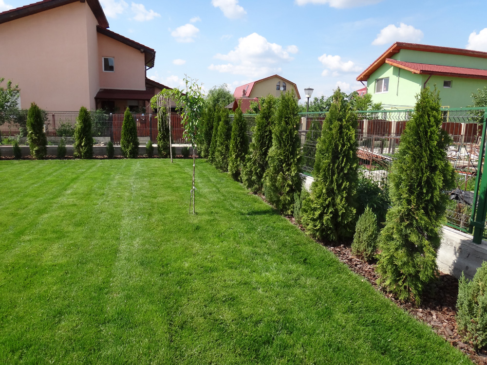 De cele mai multe ori simplitatea inseamna o gradina care iti ofera sentimentul de libertate. Aceasta este o gradina spatioasa, aerisita si cu nevoie minima de intretinere. Prin gardul viu de Thuja s-a urmarit delimitarea spatiului, crearea unei bariere vizuale pentru a obtine intimitate. Gazonul existent a fost inlocuit cu gazon rulouri rezistent. In cativa ani plantele vor creste considerabil in diametru si inaltime, vom avea astfel un gard viu compact, verde tot timpul anului.